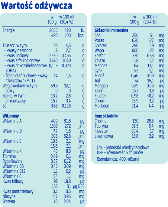 - Posiada optymalną osmolarność: 400 mOsm/l.